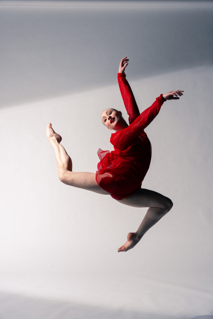 A ballet dancer is captured mid-air in an elegant pose against a dark background.